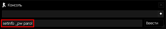 "123.45.67.89" "" "abcdefghijkmnopqrstu" "de" "123.45.67.89" - следует вписать свой айпи, Пароль указывать не надо. 4) Сохраняем Теперь перед тем как зайти на сервер, пропишите в консоле - setinfo _pw Ваш_Пароль (см рис)